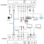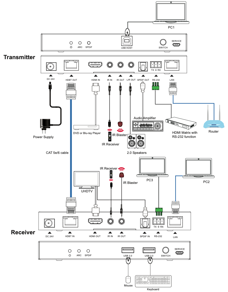 The extender includes two units, transmitter and receiver. The transmitter captures the incoming signals and transmits them over one cost effective CAT5e/6 cable. The receiver unit receives the signals and presents them as outputs for connecting to your devices.